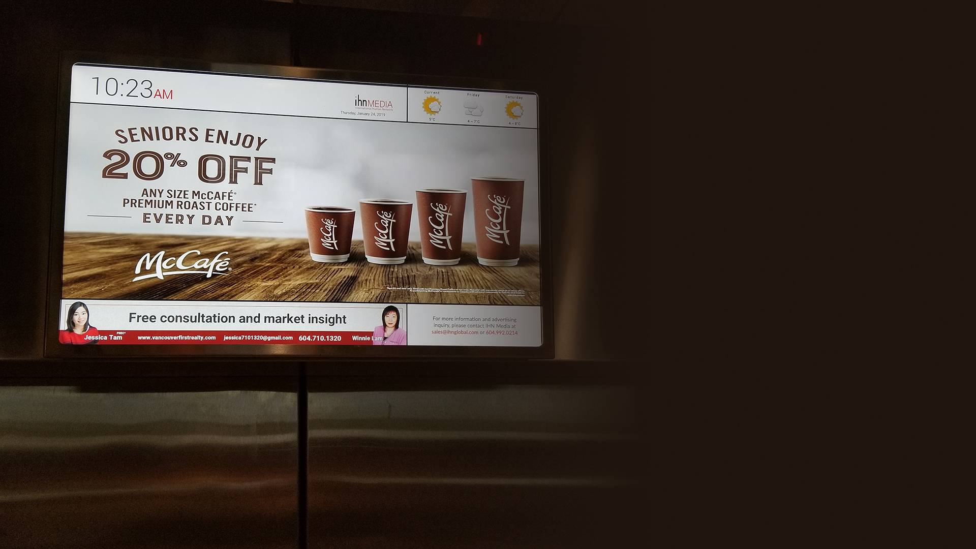IHN Media has aggressively taken on challenges to complete and deliver tangible results to our clients in today’s saturated advertising market where consumers are changing radio stations between songs, turning TV channels to avoid commercials and throwing away over 90% of the ad flyers that they receive at home. By installing our LCD-based broadcasting stations inside the elevators of luxurious residential condominium towers, we are able to target tens of thousands of upper income earners 24/7.